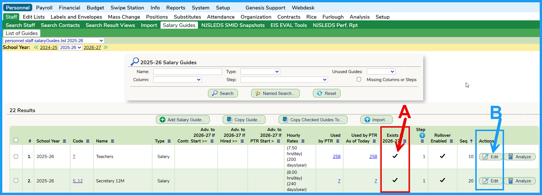 If the district would like the system to project contractual salaries for the budget build year, the District MUST have salary guides in SchoolFi for the budget build year. The following procedures MUST be performed for each and every salary guide. Go to the Personnel >>> Staff >>> Salary Guides tab and select the current year in yellow.