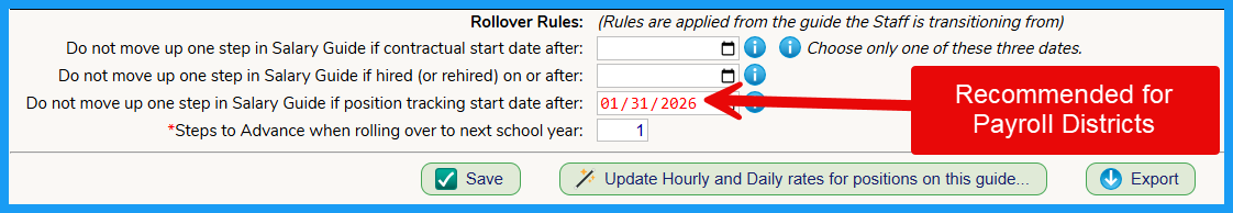 - Enter the date for the “Do not move up one step in Salary Guide if position tracking start date after ” (Position Start Date from each individual's Position Tracking Record Date of Hire tab) field.