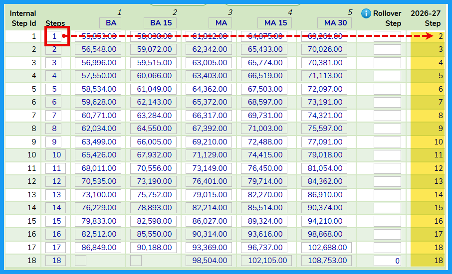 After you have set all the Rollover Rules (Step B) you can review & verify the Internal Step movement from the current year to the following year. For the example below, the staff is moving up one step - Internal Step 1 will move up to Internal Step 2 based on the Contractual Start Date and the Date of Hire.