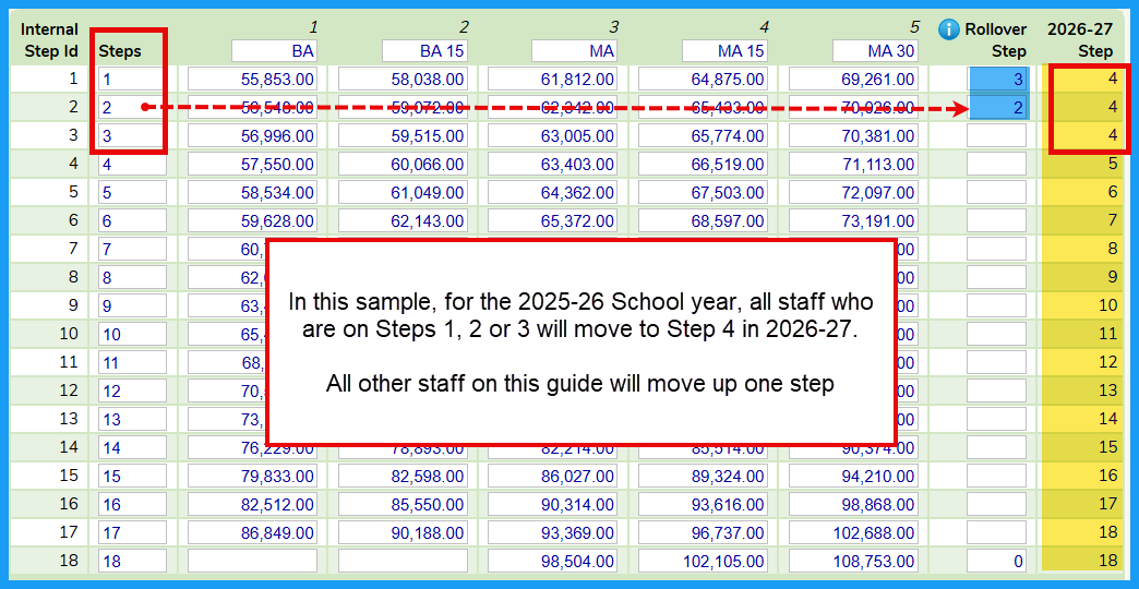 You can customize the Internal Step movement by entering the Override Number of Steps to Advance when rolling over to next school year. If your staff is moving up more than one step, see this example below. You will enter the number of Internal Steps that the employee will move upon rollover. For the example below, Internal Step 1 in the current year is going to Internal Step 4 in the following year. The proper setting will be as follows: