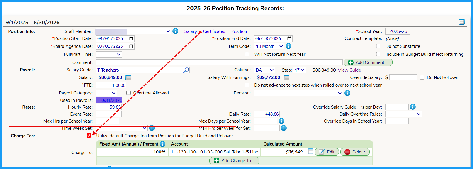 If you go into an individual’s Position Tracking Record (PTR) the feature is located in the red box below. Check the box if you want to utilize the default charge to on the Position Record and NOT the charge to on the PTR.