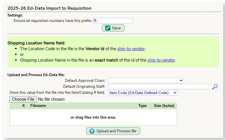 - Store this value fromthe file into the Item/Catalog # field - to have the Ed-Data item code populate on the requisition, leave the selection at "Item Code (Ed-Data Defined Code)"