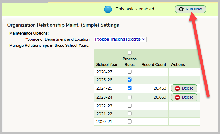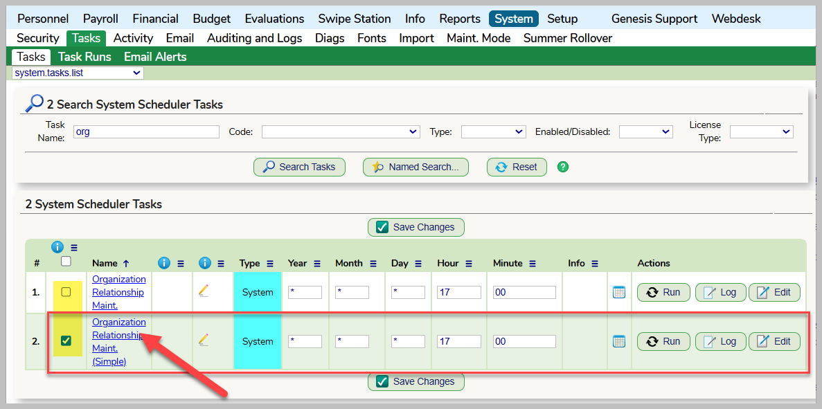 Navigate to the System >> Tasks >> Tasks tab and search for "org". Locale the Organization Relationship Maint task that is checked off and click on the name of the task to open the settings: