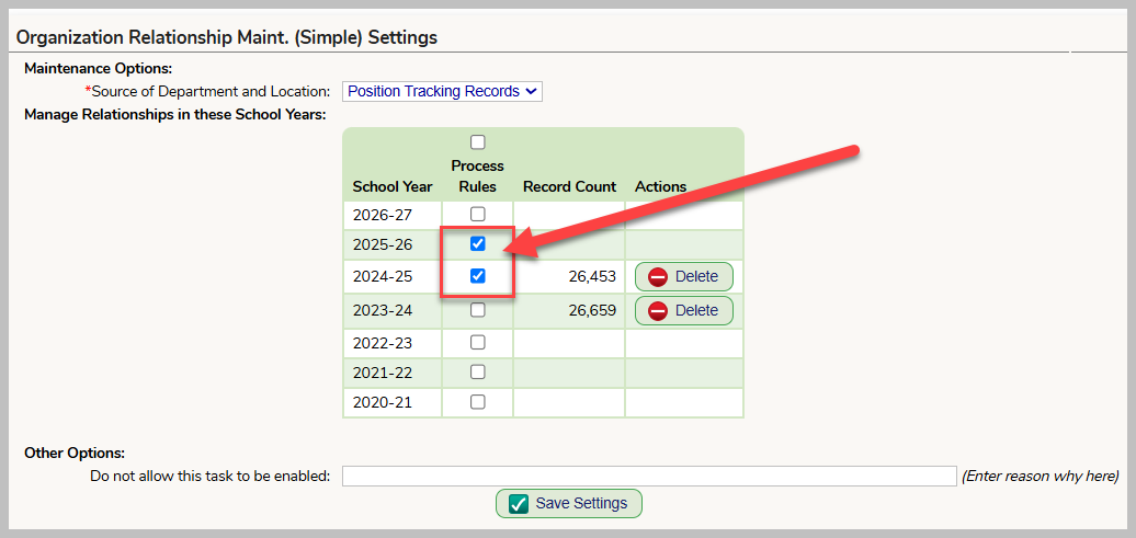 Ensure that 2024-25 and 2025-26 are checked off and save the settings.