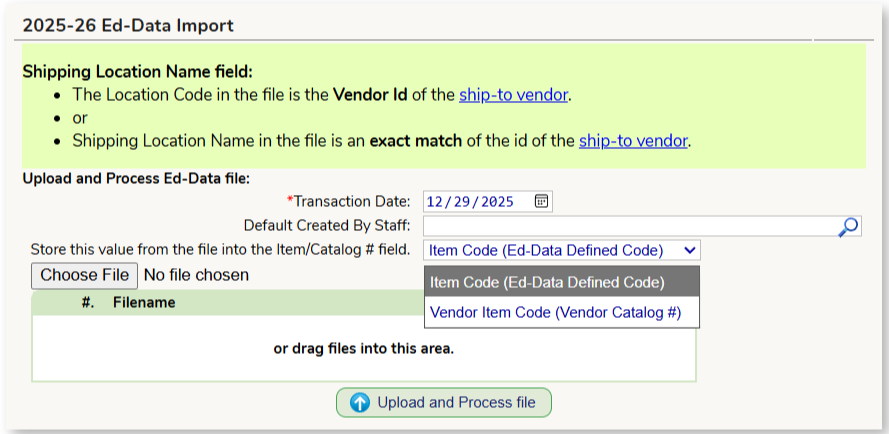- VERY IMPORTANT - be sure the CODE of the Ed Data ship-to location is the EXACT same "Id" in SchoolFi. Otherwise you will receive an error.