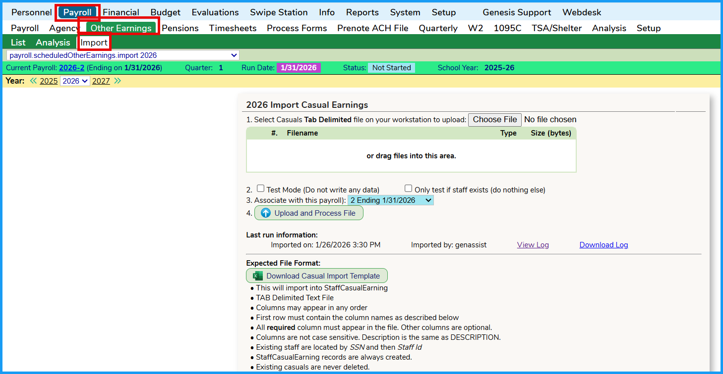 - If you want to test your upload first, leave "Test Mode" checked off. If you only want to test on existing staff, check that box. Otherwise, leave both boxes UNchecked to import the data to the employees records.