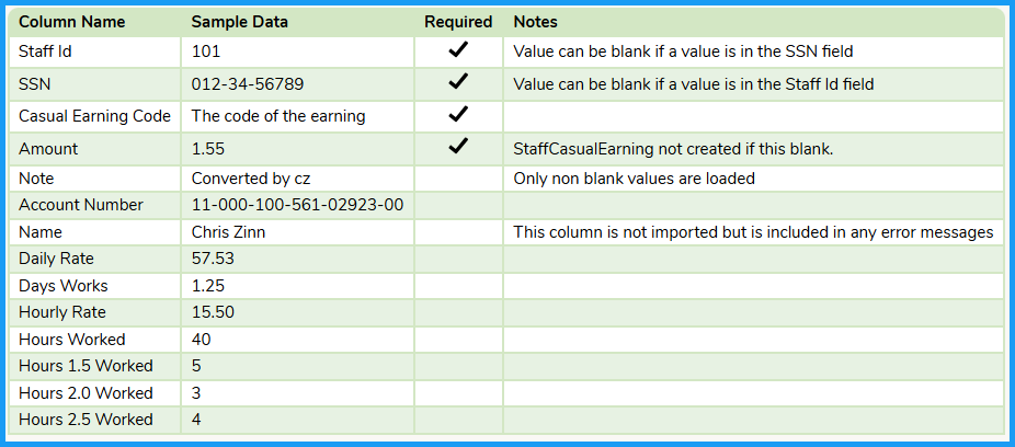 These are the fields included in the spreadsheet and the expected data that should appear in the columns as well as which columns are required. Note, you only need to use EITHER the Staff ID number OR the Social Security number, not both.