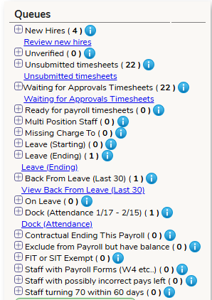 The queue entry tells you how many staff members are linked to the queue and provides a "plus sign" to expand the list and a hyper-link to take you to the first person on the list. There you can scroll through each person within that queue's list. Note that there is also a tool tip (blue i) next to each queue that explains what each queue represents.