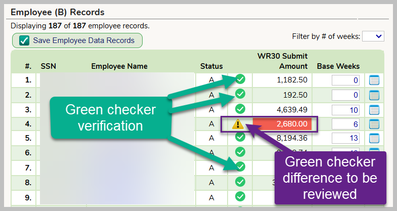 6. We recommend that you review the WR30 Submitted amount for all of the staff members. The WR30 has a built in "green-checker" and any staff members who have a difference between the calculated WR30 wages and the WR30 Submitted wages will be displayed with a red background and you will see the familiar warning triangle as highlighted below: