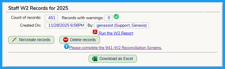 - Click the Re/create records button to generate the W2 forms for all employees.