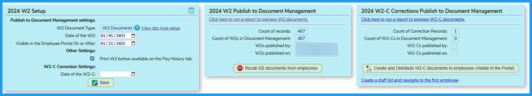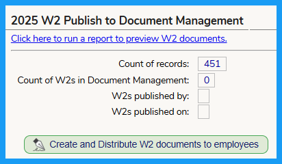 To generate the W2 documents and publish them to staff members' employee portals, click the "Create and Distribute W2 documents to employees" button.