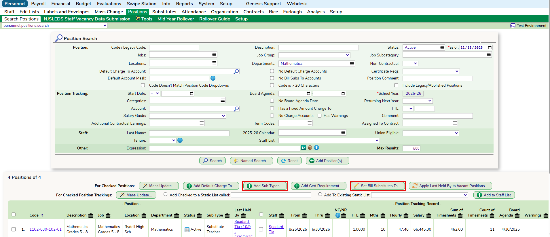 In the example below, we have searched for everyone in the Math Department. The results show 4 positions. We will mass assign the Substitute Types that apply to each of these positions.