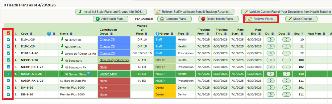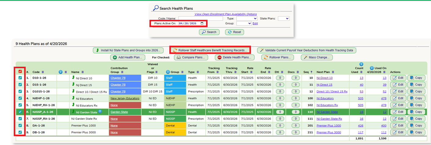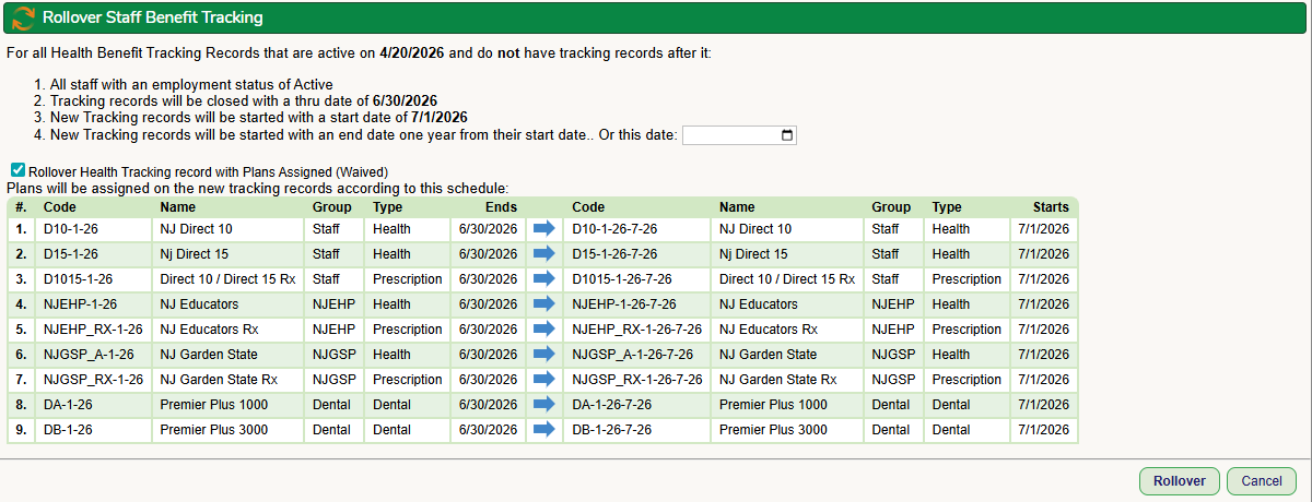 Go back to the List of Plans tab and change the date to the current date. In the first column, check the boxes for plans you wish to roll the staff members over, and click the “Rollover All Staff Healthcare Benefit Tracking Records to the next date that the rates change” button.