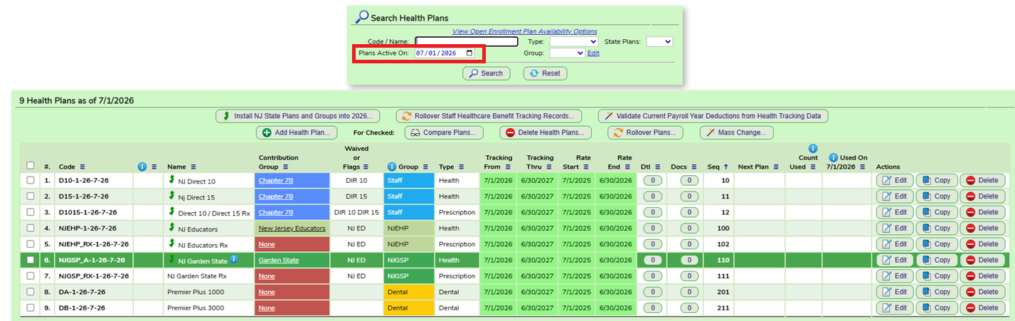 Be sure you are in the next period by changing the “Plans Active On” date field to the start date of the next period. In this example, the old plans ended June 30th, 2026, so to see the rolled over plans you will change the date to July 1st, 2026, as highlighted below: