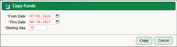 Enter the From Date and the Thru Date for the new health plan period / year and set the sequence number for the first new record. We recommend you select a sequence number higher than the last current sequence number. Then click on the Copy button.