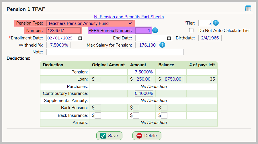 - REQUIRED: Pension Type of either TPAF or PERS