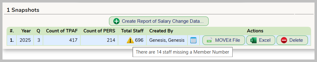 The Snapshot of the data will be taken. You will receive a yellow-triangle warning if there are any staff records that are missing a Pension Membership Number. You can click on the Excel button to review the data. We STRONGLY recommend the data be reviewed for completeness and accuracy.
