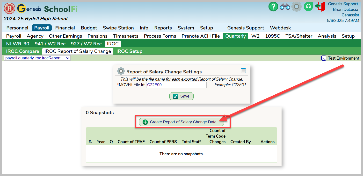 Navigate to the the Payroll >> Pensions >> IROC Report of Salary Change tab. Click on the Create Report of Salary Change Data button.