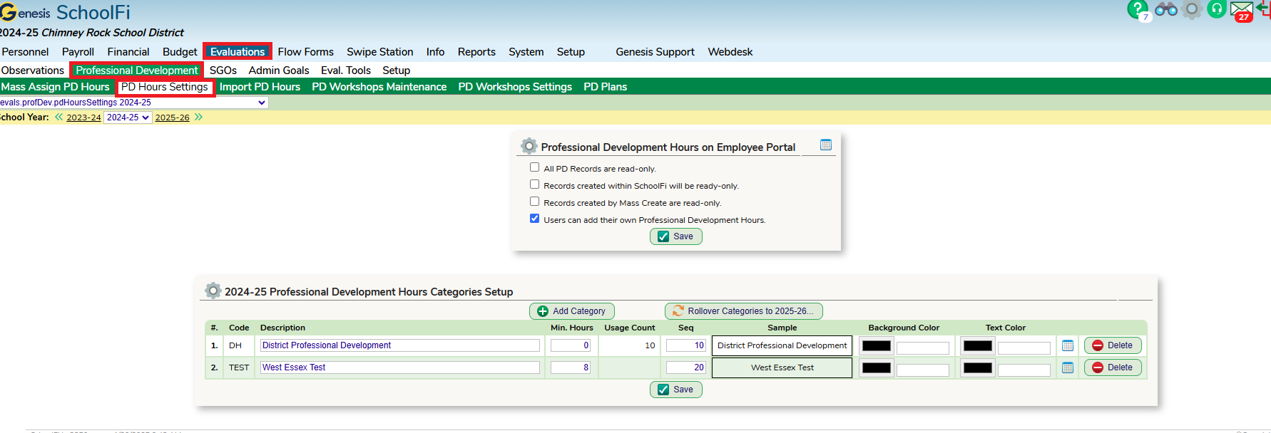 To view these settings in Staff Management, navigate to the Evaluation > Professional Development > PD Hours Settings.
