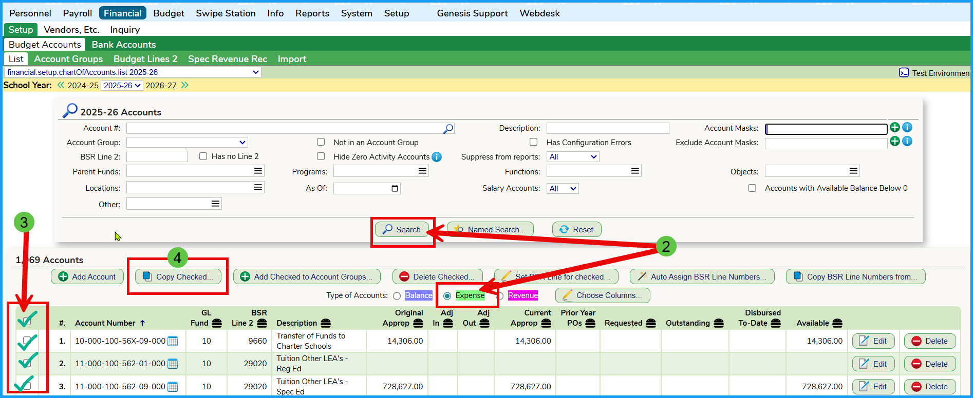 - Go to the Financial >>> Setup >>> Budget Accounts >>> List screen and select the current year in yellow.