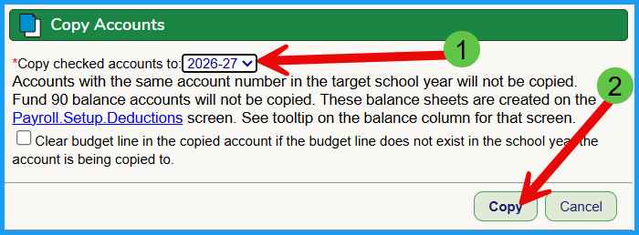 - Check all accounts, or check the accounts that you want to rollover into the following year
