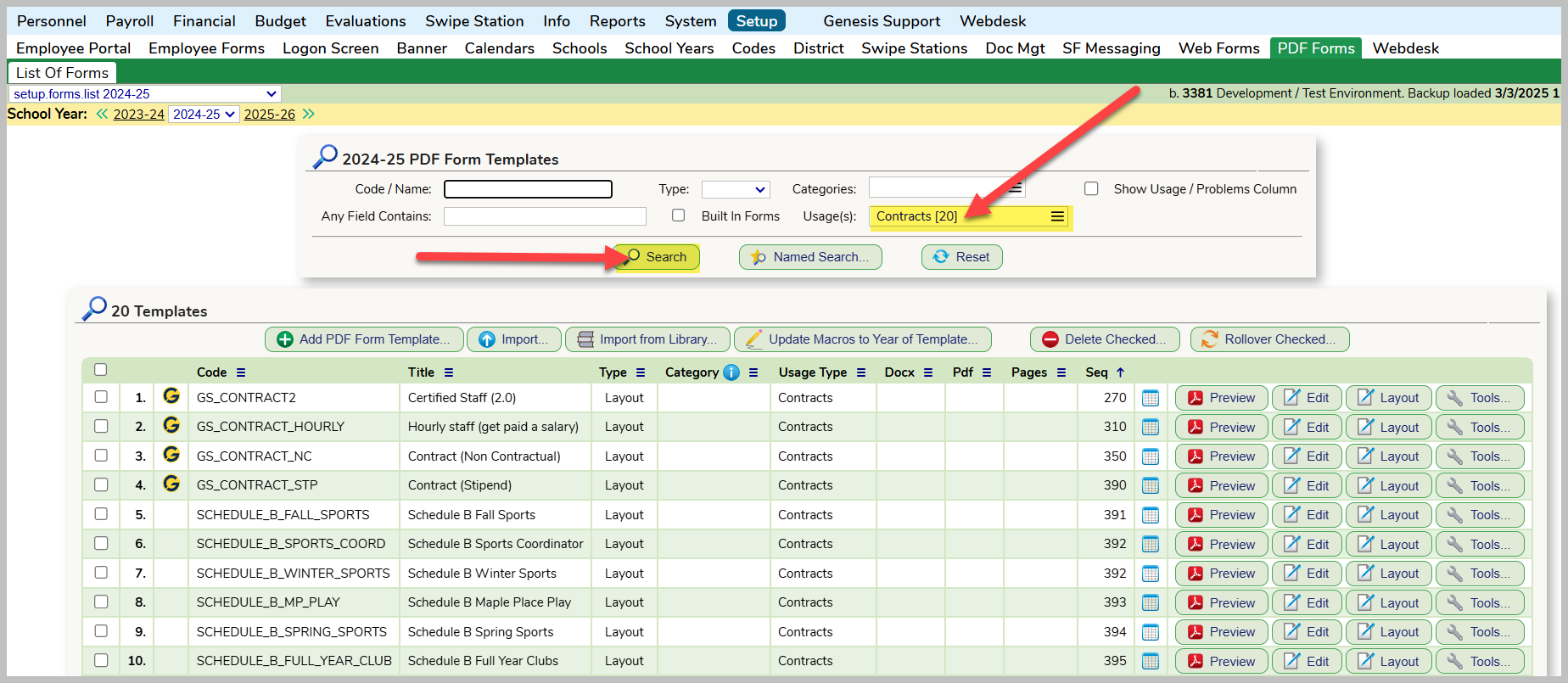 Go to the Personnel >>> Setup >>> PDF Forms screen and select the current year in yellow. In the Usage(s) box, select Contracts and click on the Search button.