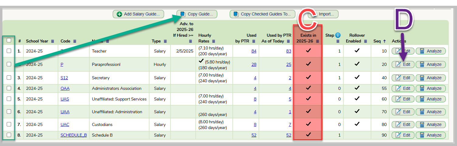 You can customize the Internal Step movement by entering the Override Number of Steps to Advance when rolling over to next school year. If staff members on a particular step (like the top of the guide or an Off-Guide, you will enter "0" in the rollover Step column (as highlighted in purple above)