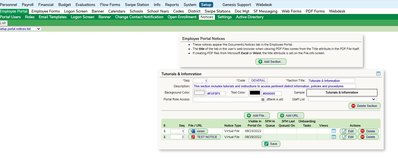 Each notice is set up as a "section". To create a new section, navigate to the Setup >> Employee Portal >> Notices tab and click on the Add Section button.