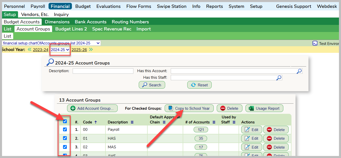 If the District bult the succeeding year budge in SchoolFi, the account groups (generally) have been rolled or, or copied, to the succeeding year. If they were not, go to the Account Groups tab, select the account groups that you want to roll over, or copy, to the succeeding year (red arrow) and click on the Copy to School Year button (purple arrow).