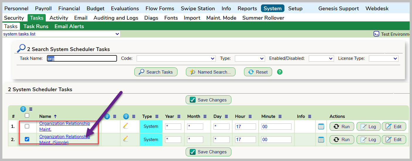 The District must update the Organization Relationship Maintainer (Simple Mode) System Task. This will apply the Organization Relationships to the succeeding year. Go to the System >>> Tasks tab and ensure the "Simple Mode" task is enabled and the other mode is disabled (red arrows).