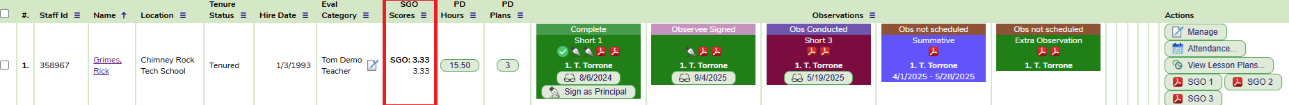 Once a staff member is searched for, you will get a screen that shows you their local id, name, tenure status, eval category, sgo scores, and any of the evaluations this staff member will receive. You can view the observation reports and their rubrics, the self assessment report and the rubric.