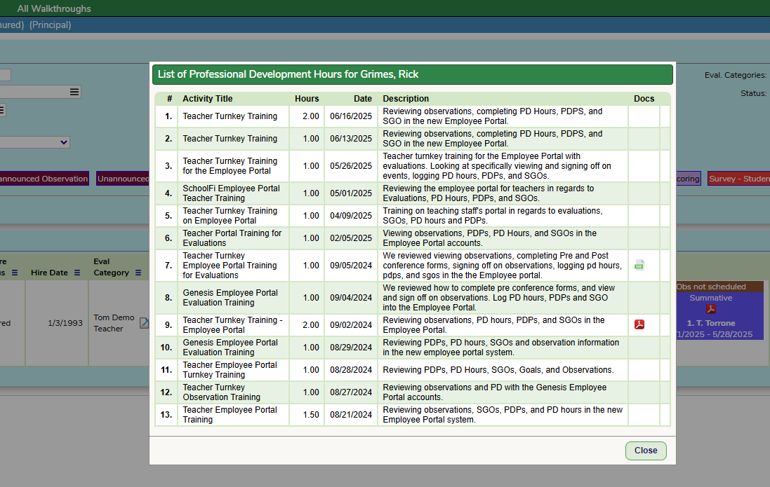 The PD Hours column has a button with a number on it. This number is the current total PD Hours that staff member has logged in the system under their "Hours" tab. When you click on this button, a popup will display to show you each individual PD Event and the individual hours logged.