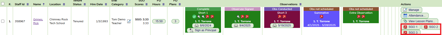 You can view the submitted SGO forms for a staff member from the "Actions" column. When you click the "SGO #" button, the PDF report will load for that SGO form.