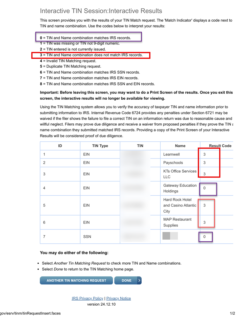 - Interactive TIN Matching – verify up to 25 name/TIN combinations and results will be received immediately. The user can input name/TIN combinations in groups of 25; there is a limit of 999 requests during a 24 hour period.