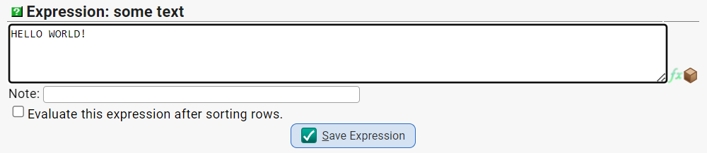 Here is a perfectly fine Expression Column that simply contains the literal text "HELLO WORLD" - and will print exactly that in each and every row: