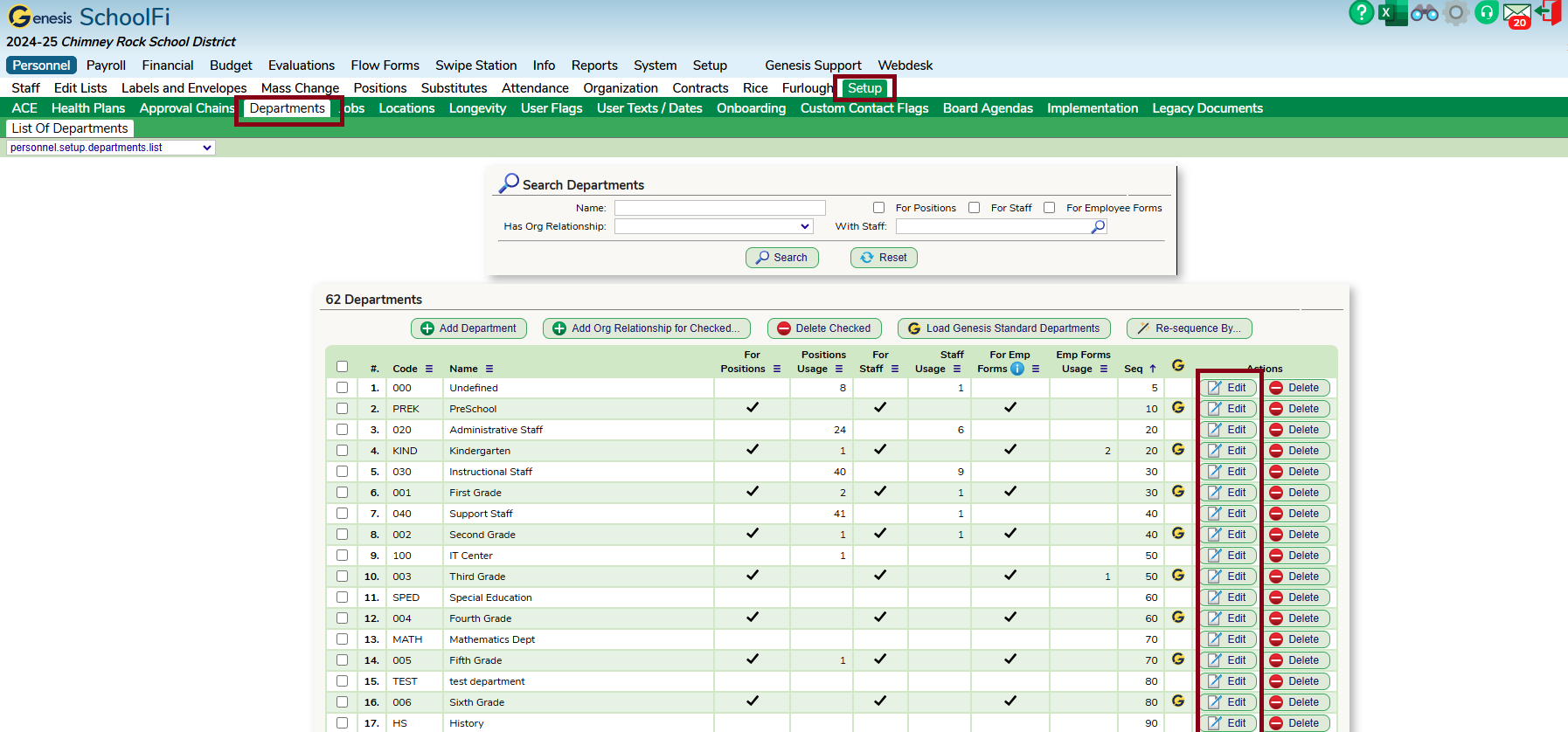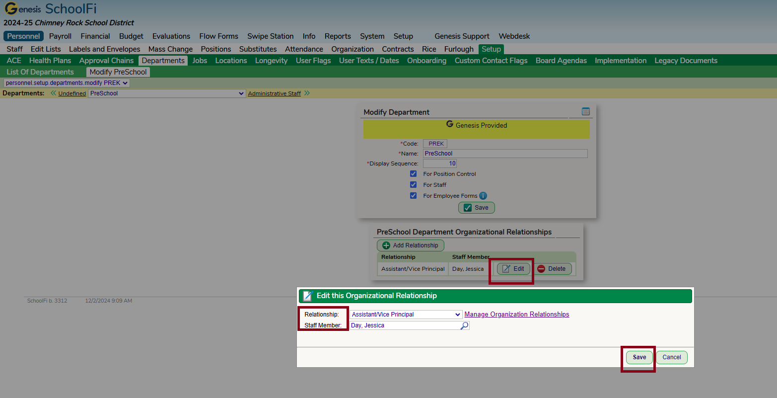 Departments (Tan) – Personnel – Set up – Departments – click on the Edit button – in the “Department Organizational Relationships” notecard, look for the relationship you want to update and click on the edit button - Remove old staff member and add new staff member – Save