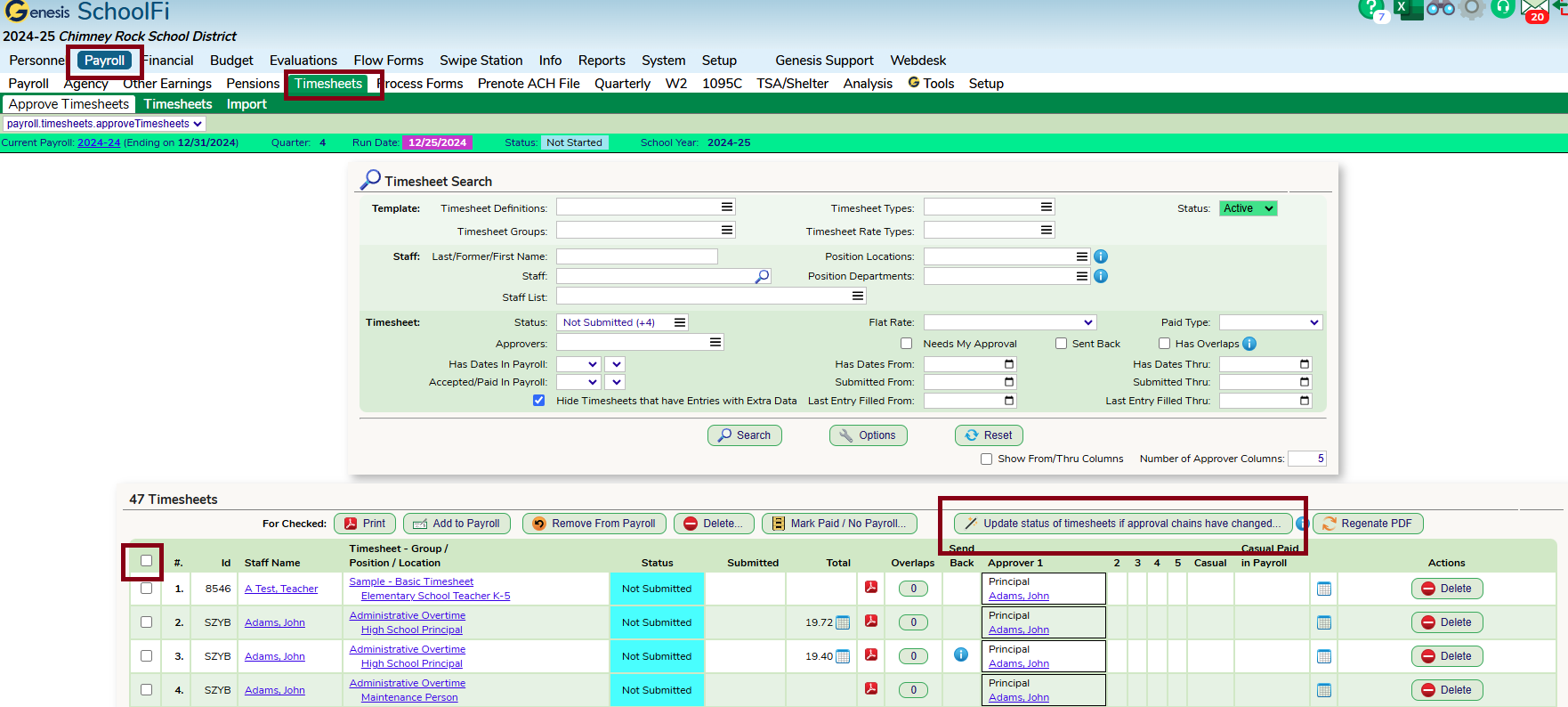 Timesheets – Payroll – Timesheets – Search for your timesheets you need to update – once populated check off the box in the top left-hand corner to highlight all timesheets – click on the “Update status of timesheets if approval chains have changed...” button