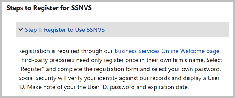For more detailed instructions on registering and/or using SSNVS, see the Social Security Number Verification Service Handbook.