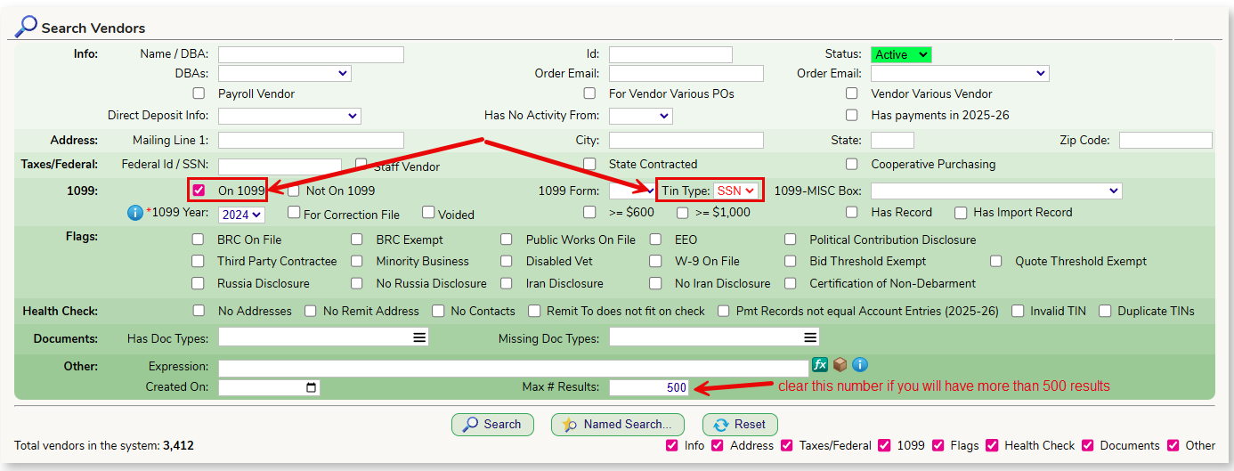 To search for all the District's 1099 vendors that are utilizing a SSN, the District can navigate to the Financial >> Vendors, Etc >> Vendors >> Search tab and utilize the search criteria below. To edit the vendor, click on the Edit button and then add the first and last names as per the screen shot above.