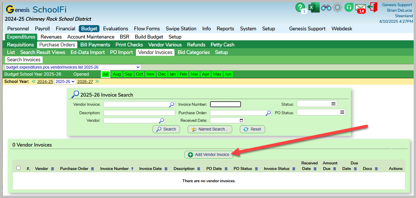 To upload a vendor invoice, navigate to the Budget >>> Expenditures >>> Purchase Orders >>> Vendor Invoices tab and click on the Add Vendor Invoice button.