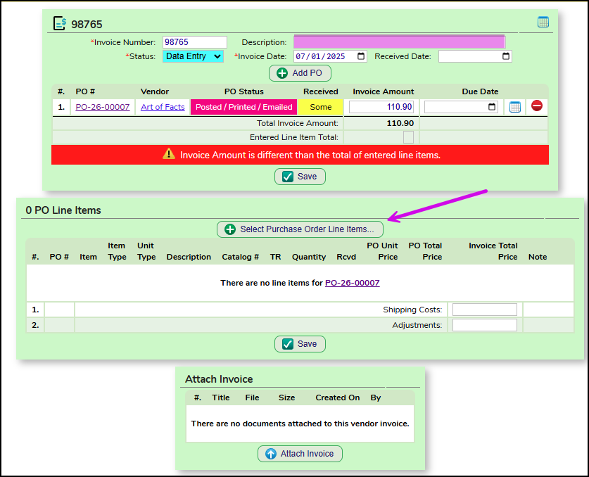 NOTE: If your district is using the rules of the receiving module, ONLY lines that have all or some items received will be allowed to be paid. In this example, line 1 has all items received and line 3 has some items received. Those are the only lines that should be on the invoice and the only lines that should be able to be paid.