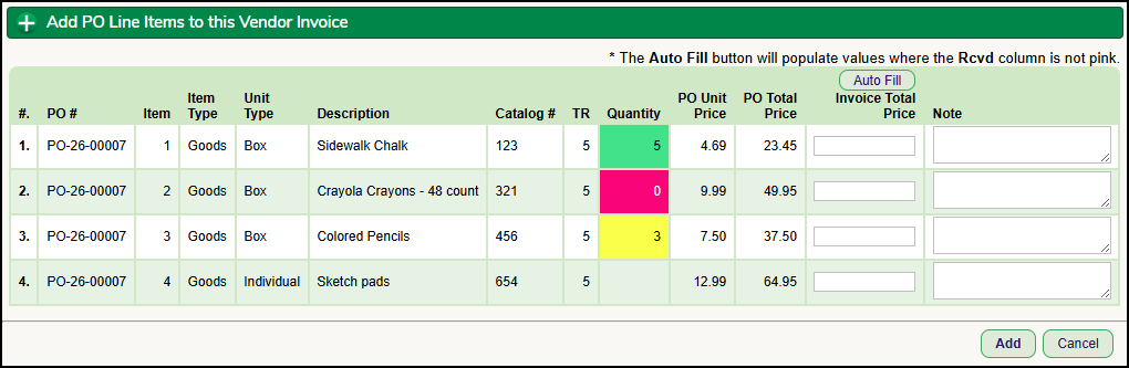 For each row/line item, you MUST enter the amount of the PO line item that is included in the Vendor Invoice. This amount can be the same as, less than or greater than the PO amount. If the invoice is for the full amount of each line item on the PO, you can click the Auto Fill button to automatically fill in each line amount. In addition, you can enter a note for the PO line. After the amounts are entered, click Add.