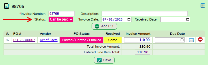Once all of the information has been added to the Vendor Invoice and the total of the Vendor Invoice equals the total of all PO Lines denoted as included in the Vendor Invoice, the status can be changed to Can Be Paid. Click Save after choosing this status.