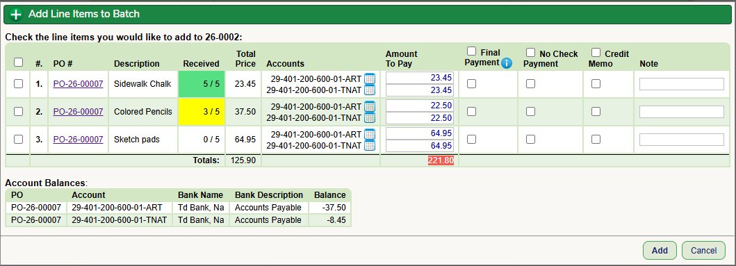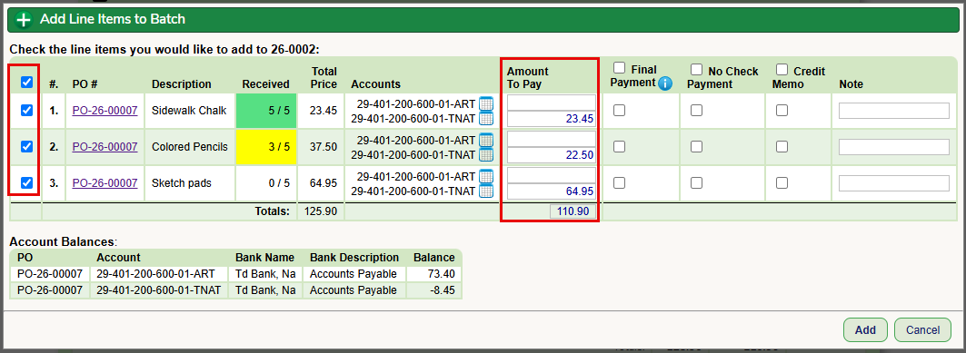 When you are ready to put the data into the payment batch, check off all the line items to be paid and click the Add button. The PO and invoice data is then moved to the payment batch you chose. You will then process the batch payments as you have always done.