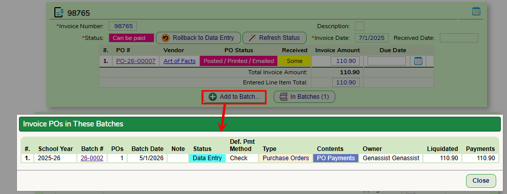 Once the status Can Be Paid is saved, the Add to Batch button will appear and the Vendor Invoice can be added to a Batch for payment.