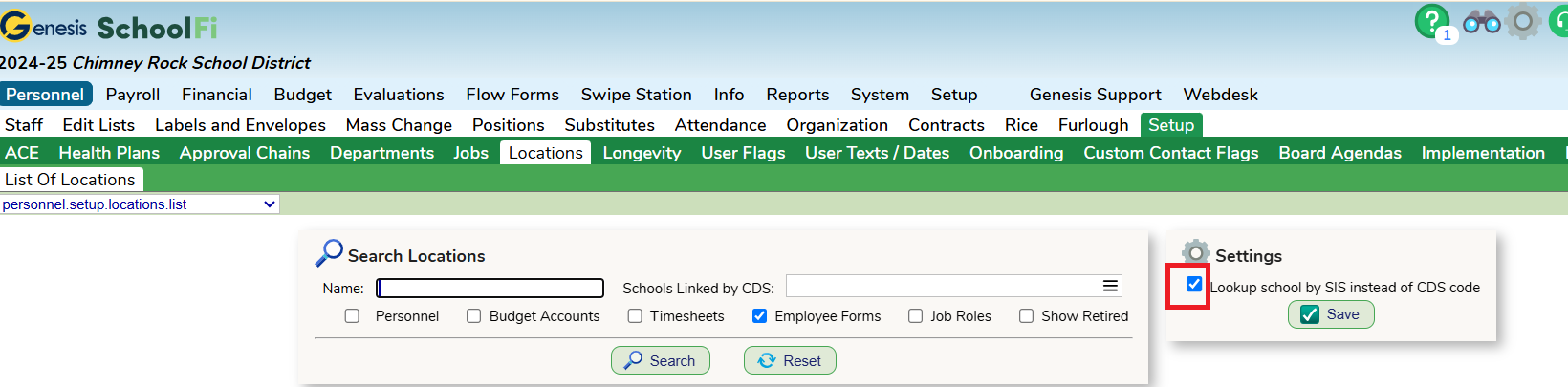 On the Personnel - Setup - Locations - List of Locations screen check the box for "Lookup school by SIS instead of CDS code" and "Save".