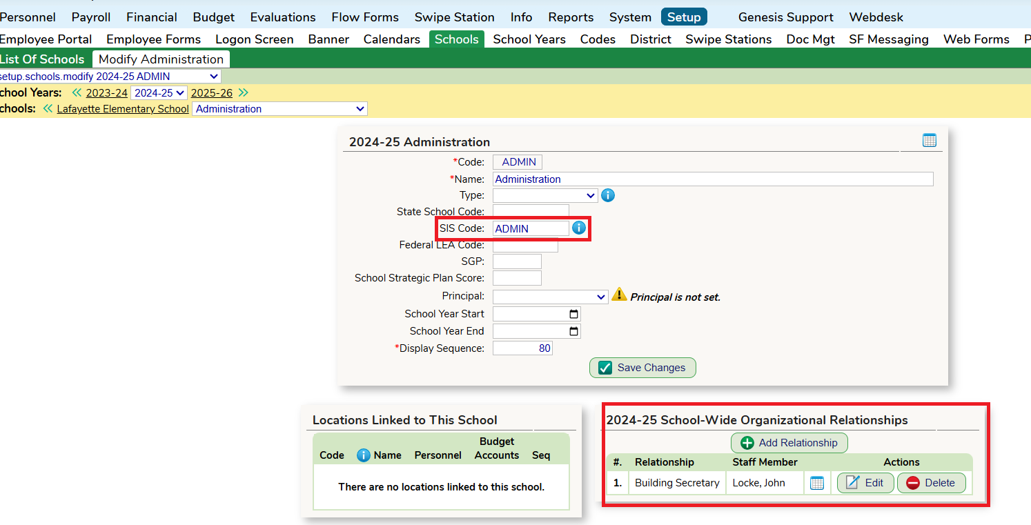 Go to the Setup -Schools - List of Schools screen and find the School that matches the Location, select "Edit". On this screen you will add in the same custom code that was entered on the Locations screen as well as any changes to the School-Wide Organizational Relationships