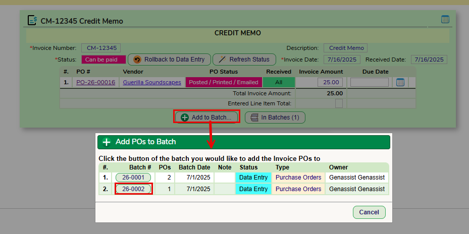 3. Add the credit memo to the same batch the PO payment is already in. Click the Add to Batch button.