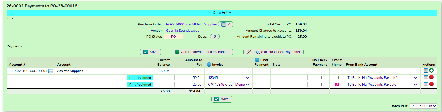 IMPORTANT - the payment for the PO must already be entered into a batch BEFORE you add the credit memo to the same batch. The system will add the credit memo as a second payment line to the existing PO payment record.