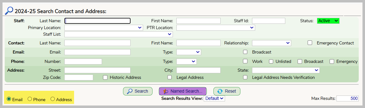 In SchoolFi, the Search Result View can be combined with the Contact and Address tab to create custom reports that contain contact and / or email information. To create a custom report, navigate to the Personnel >> Search Contact and Address tab.